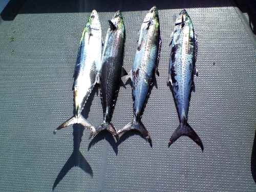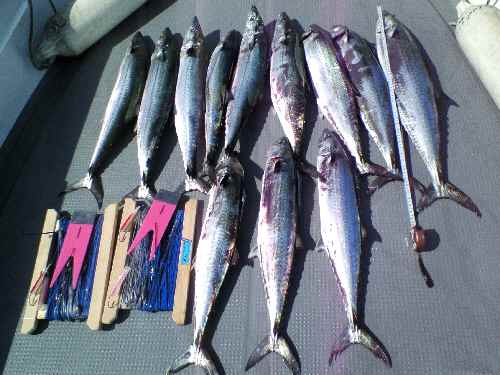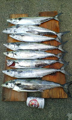 次第に風も落ちてきたので、その辺りをグルグル曳いていると、また、パラパラと釣れ始めました。二~三度はバラシましたが、計、8本釣上げたところで帰港しました。大きさは50センチから70センチのサゴシとヤナギ、8本の収穫でした。