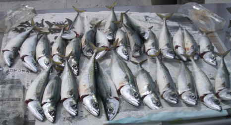 朝の早くにいつものポイントに到着しましたが、1匹間抜けな大きいサバがハマチテンテン仕掛の下針にヒットしましたが、それ以来全然アタリがありません。はやくも、「まあ、坊主じゃないし」と予防線を張っておきましたが、心の中では(これじゃあ、かっこ悪いし・・・)とあせっおりました。すると、少し離れた海面がぽちぽち雨が降っているようになっていたので、ナブラかもしれないと急行しました。すると、ハマチテンテン仕掛にスズキ(60cm程度)が1匹釣れました。結構大きかったです。でもこの間のブリの激しい引きと比べると、あまりにも手ごたえがなく、あっけなかったのです。そしてこのあと、移動中にツバスが2匹かかりました。その後、魚探に何も映らないので深場に行きアジ潜航板仕掛を流しました。仕掛のチェックのため何度もビショマを上げたり下げたりで指の皮がめくれそう。そしてとうとう仕掛の下のほうの針にサバが2匹かかりました。これで合計、サバ3匹・スズキ1匹・ツバス2匹・の釣果がありました。