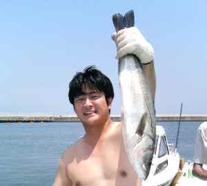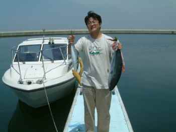 同行するはずだった、あとの2名メンバーは深夜2時に集合をかけたせいか、寝坊して欠席となりました。さて、淡輪を出航して言われたとおりの場所で言われたとおりに曳きはじめました。そしたら開始して5分もたたずに、またまた、メジロ70cmを釣ってしまいました。そして、あと、1匹はハマチが釣れました。