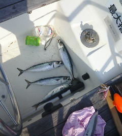 翌日、和歌山下津沖の沖ノ島の南でやってみたところ、一発でサバの40センチくらいのが5匹いきなりかかりました。。でも、ヨットで行ったのでイケスがなく