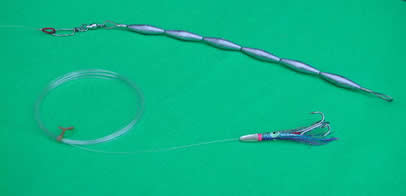 カツオ用ビシオモリとルアーをセットした写真です。白波が出てきたらヒコーキやラビットをはずして、このビシオモリを付けてルアーに接続して曳くほうが食いがよくなります。